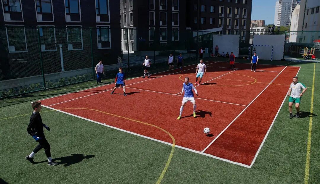 图为俄罗斯莫斯科,市民在小型球场踢足球。
