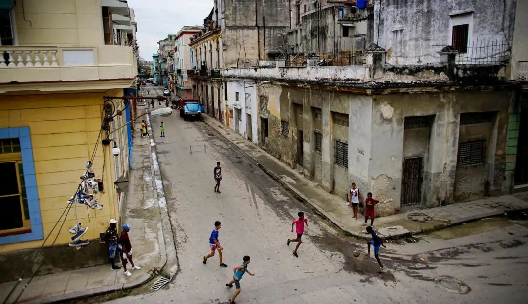 图为古巴夏湾拿,小朋友在马路中心踢足球。(Alexandre Meneghini