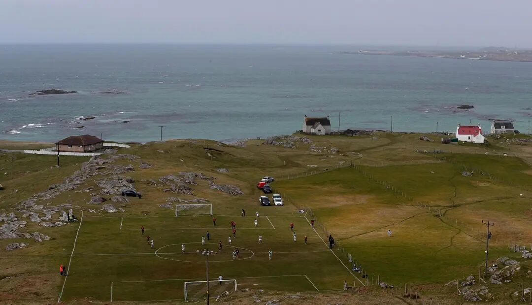 图为英国苏格兰,埃里斯凯岛及巴拉岛的球队在埃里斯凯岛上球场作赛。