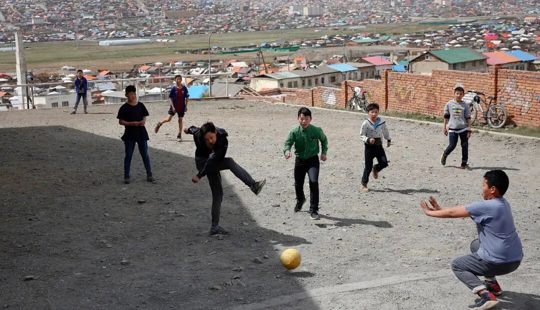 图为蒙古国乌兰巴托,小朋友在一处空地踢球。