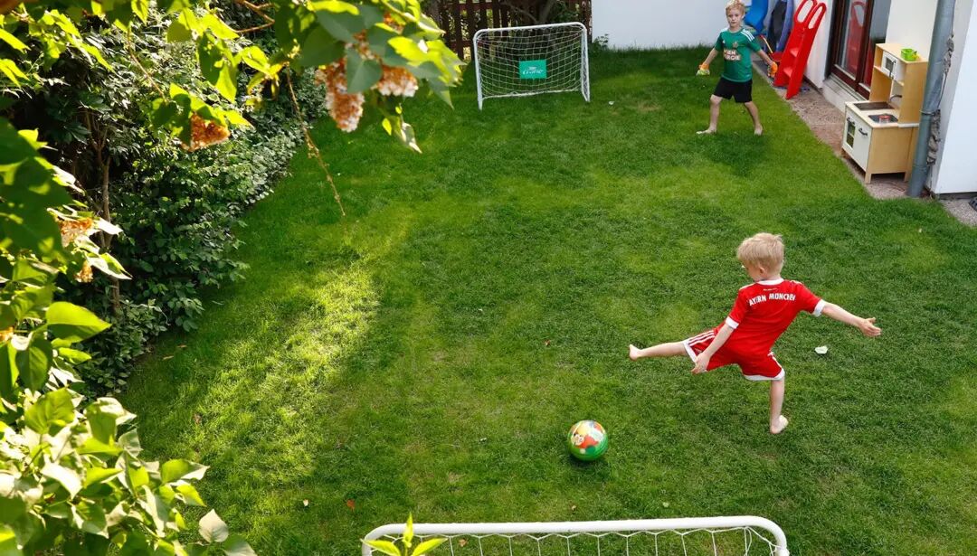 图为奥地利维也纳,小朋友在家中花园踢球。