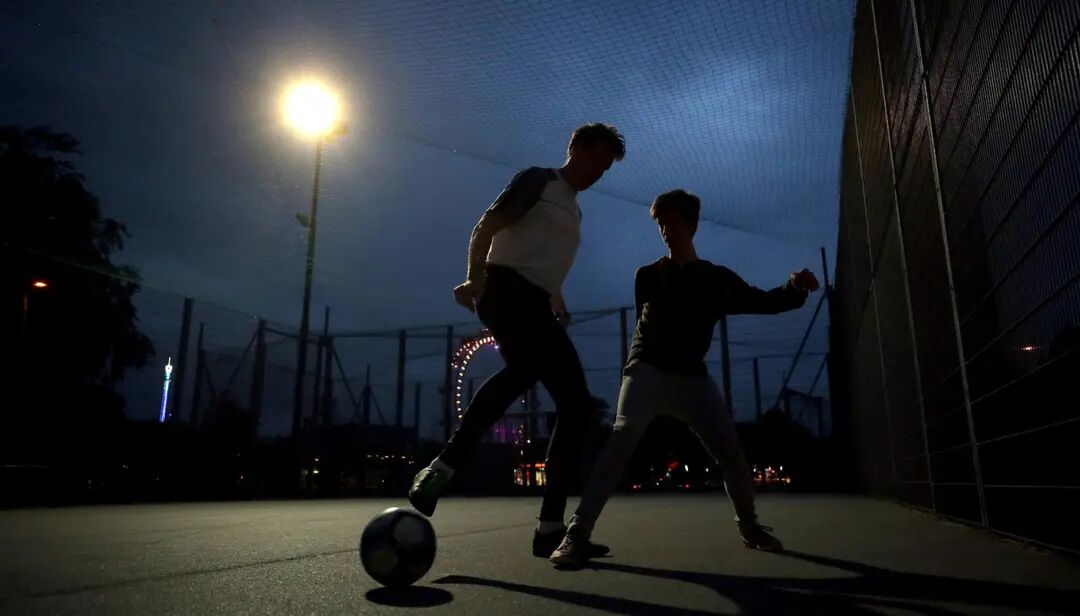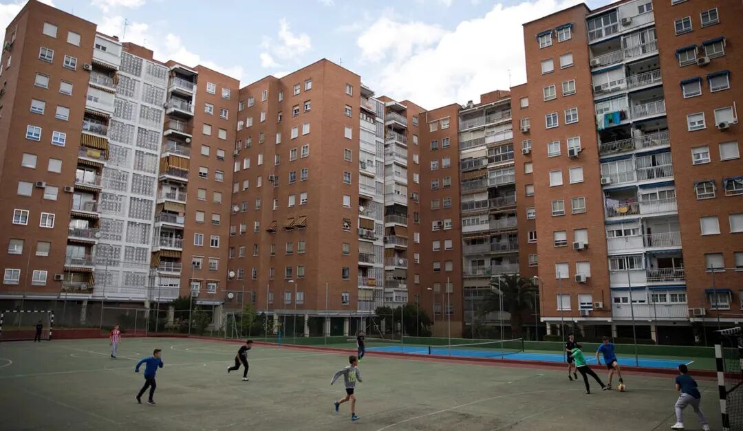 图为西班牙阿尔科孔(Alcorcon),小朋友在球场踢球。