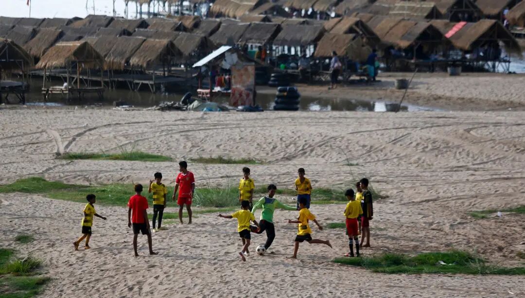 图为柬埔寨金边,小朋友在水边沙地踢球玩耍。