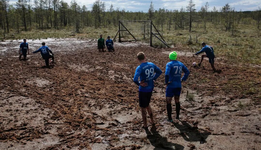 图为俄罗斯列宁格勒,村庄居民在泥泞里踢球。