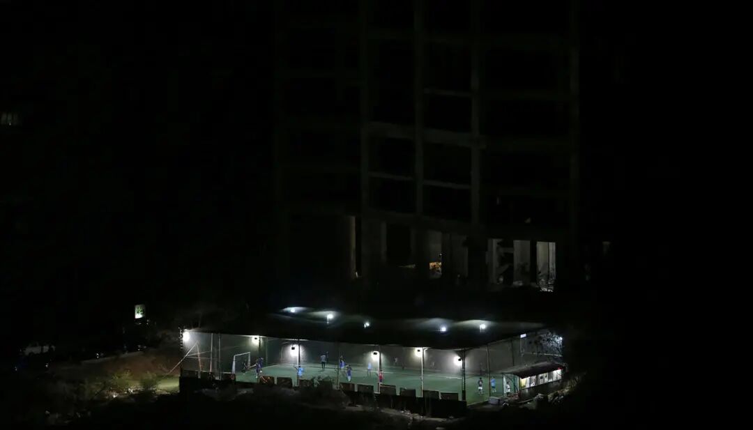 图为印度孟买,夜里球场的栏网区域内灯火通明,足球训练仍然继续。