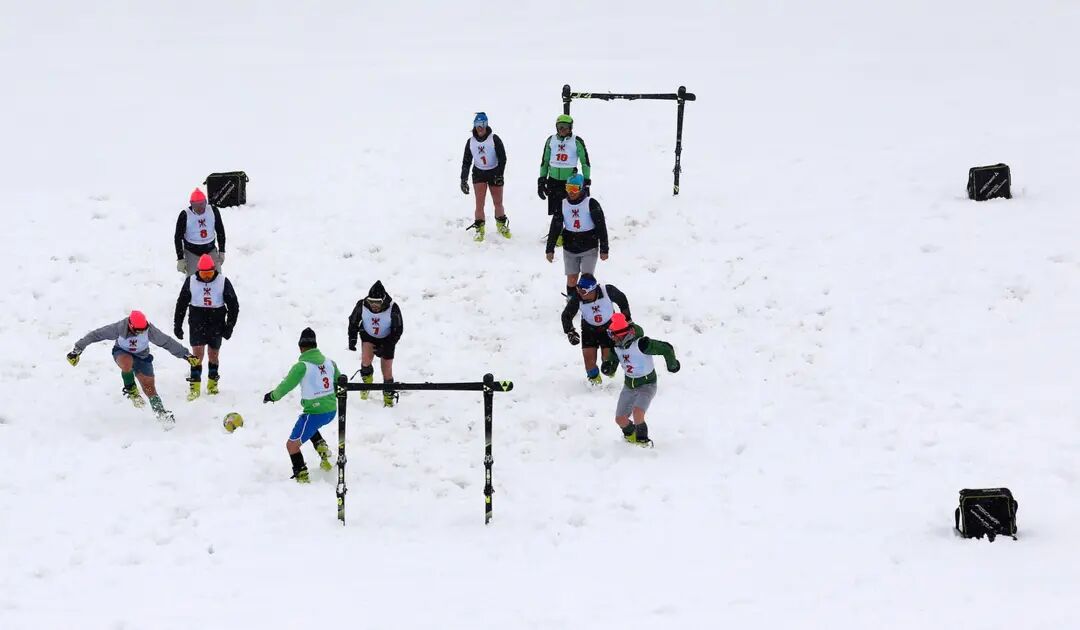 图为义大利塞斯特列雷(Sestriere),滑雪教练在雪地上踢足球,滑雪板作龙门。