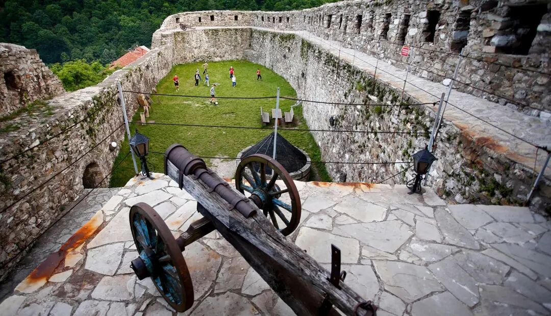 图为波黑Vranduk,小朋友在古堡中踢足球。