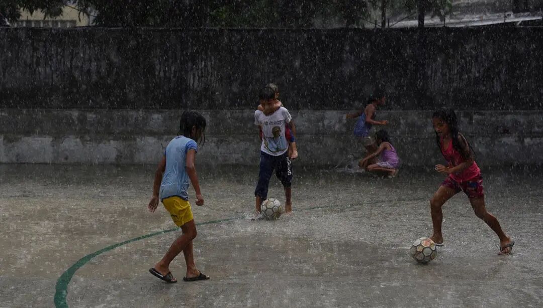图为菲律宾马尼拉,巴雅塔斯社区(Payatas)的小朋友在雨中踢球。
