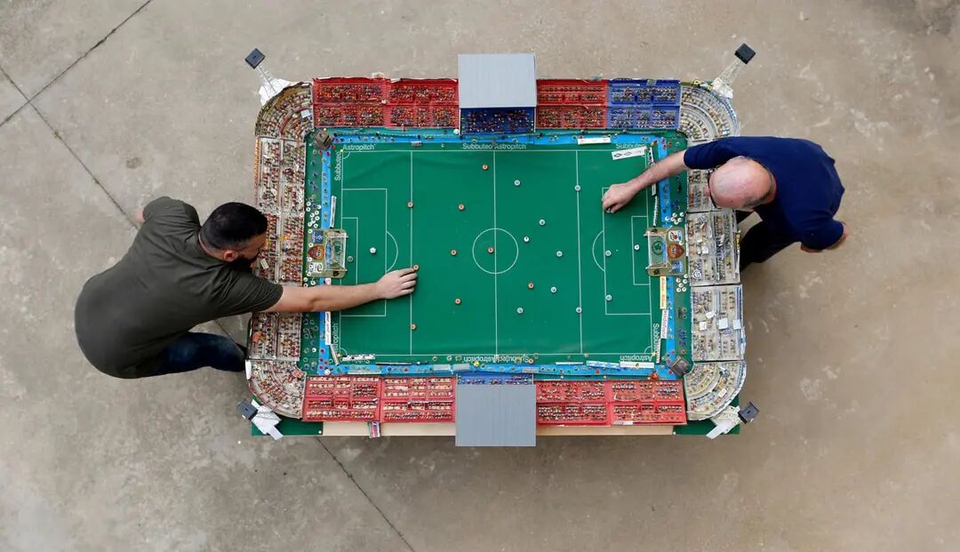 图为意大利罗马,两人正在玩Subuteo,一款模拟足球桌上游戏。