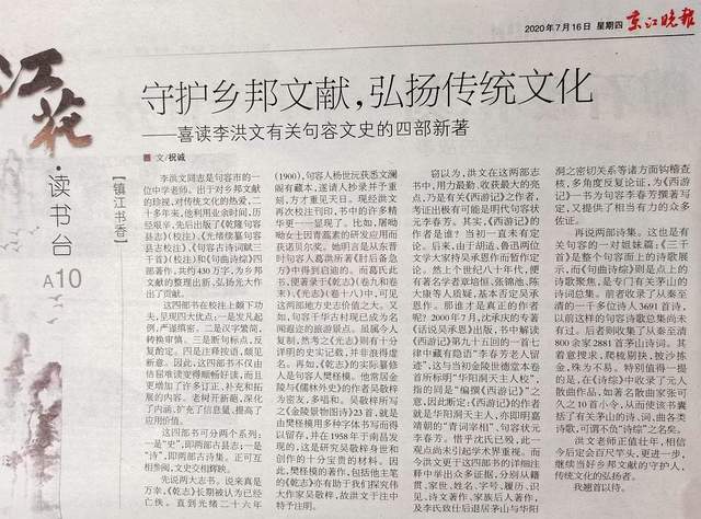 祝诚教授《京江晚报》(2020.7.16)介绍作者四书之“喜读李洪文有关句容文史的四部新著”书评。