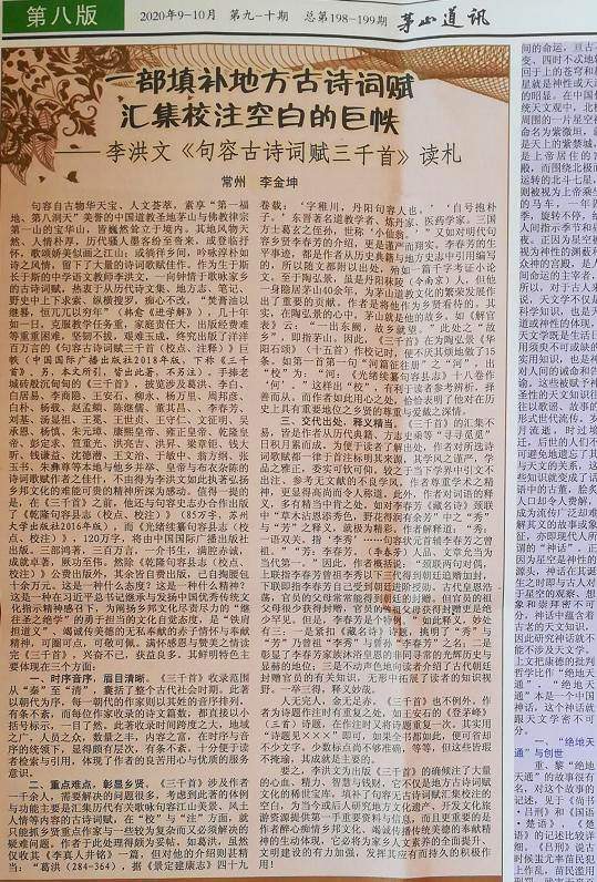 2020年10月9日,中国著名军旅作家、记者李伶先生在《镇江日报》撰文《守护乡邦文献——中学教师李洪文校注出版句容古志古诗的故事》。