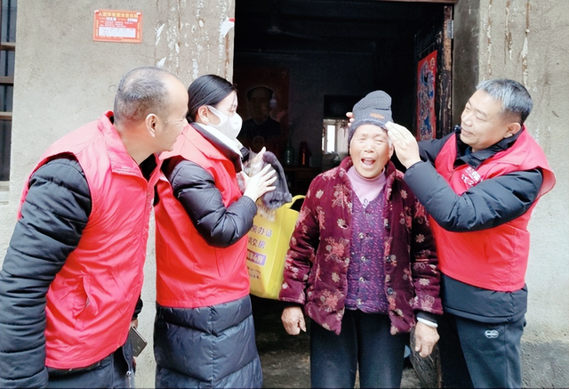“老人家,让我给您老戴上暖和和的帽子过冬哈” 这时李政撑一边说一边为村民老大娘戴帽子的一幕,让老人倍感亲切与温暖。顿时似乎“红马甲”对“志愿红”表示由衷地敬佩。