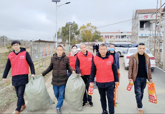 与此同时,受市人大代表,本土企业家、武穴市御江集团董事长陈昌明、总裁冯焱东的委托,最美“红马甲”御江幸福里义工、御江集团总经理李政撑身着一袭红衣穿梭在盘古垱村巷尾村前,无私无怨地和村支书蔡水恩一起为村民送来春节慰问品。这就是御江幸福里“红马甲”志愿者团队,为大家送来的米、油和老人保暖等过节物品。