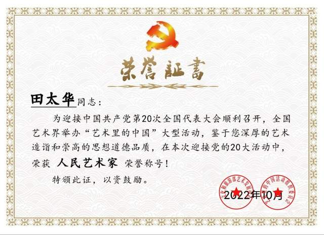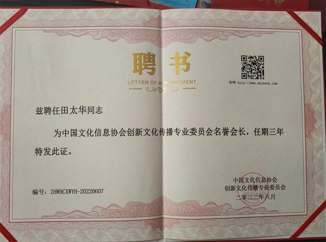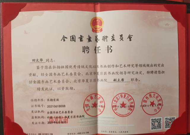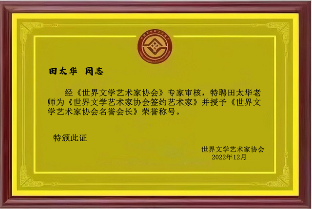介于田太华老师在艺术领域的知名度和影响力,作品风格鲜明,艺术功底深厚,其独特的艺术风格为中华文化留下了具有永恒魅力的瑰宝。经《世界文学艺术家协会》专家审核,特聘田太华老师为《世界文学艺术家协会名誉会长》。