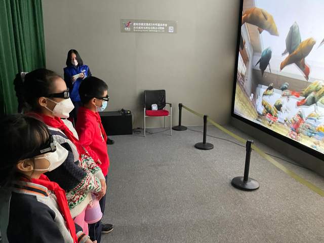 走进济南市美术馆一楼展厅,一方用纱幕围起的“秘密空间”显得格外神秘,这是美术馆专门量身创作的虚拟仿真作品《金声玉振》,队员们只要戴上眼镜就能够穿越时空,身临其境地在杏坛聆听孔子讲学,在纷纷飞花中自由漫步,在水面之下触摸鱼群摆动的鳍尾。