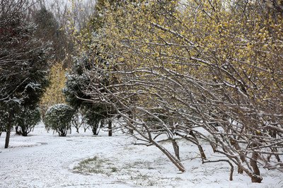 撒玉铺银颜值靓,飞花抱树美姿娇。