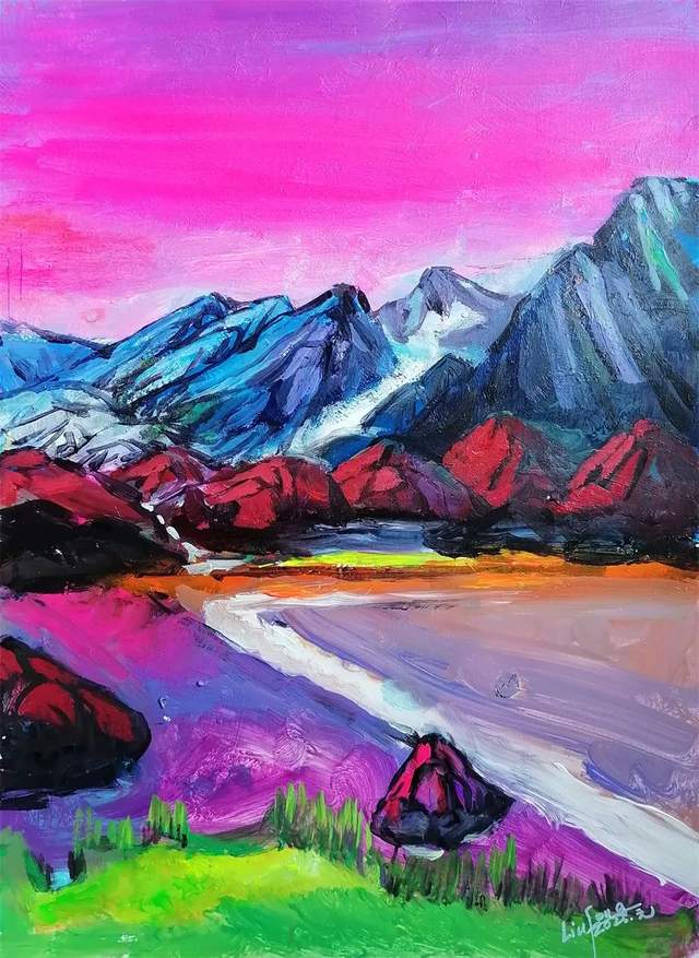 毋庸置疑,地理环境对不同地域的文化起着直接的作用,作为西部的宁夏有着悠久灿烂的历史和壮美的黄河文化。六盘山高,闽江水长。在党中央作出东西部结对帮扶的战略部署下,福建和宁夏建立起了对口协作关系。一批批福建人,包括挂职干部和支教支医工作队员,他们在宁夏书写了“福建篇章”。刘锋就是福建赴宁夏执教的一员。他在宁夏支教的 100多天,不仅出色地完成了组织交代的支教任务,还用自己的画笔画出了西部宁夏的美。这些作品除了他擅长的山水画,还有一部分油画作品。这些作品注重西部厚重地域文化的精神传达,注重艺术家个体生命的体验,注重情与景的交融中产生的诗性表达。刘锋创作题材广泛,他画山水,画花鸟,山水中有他自己对西部的观察视角与审美情趣;花鸟中有他自己对西部的个人理解与追求境界。