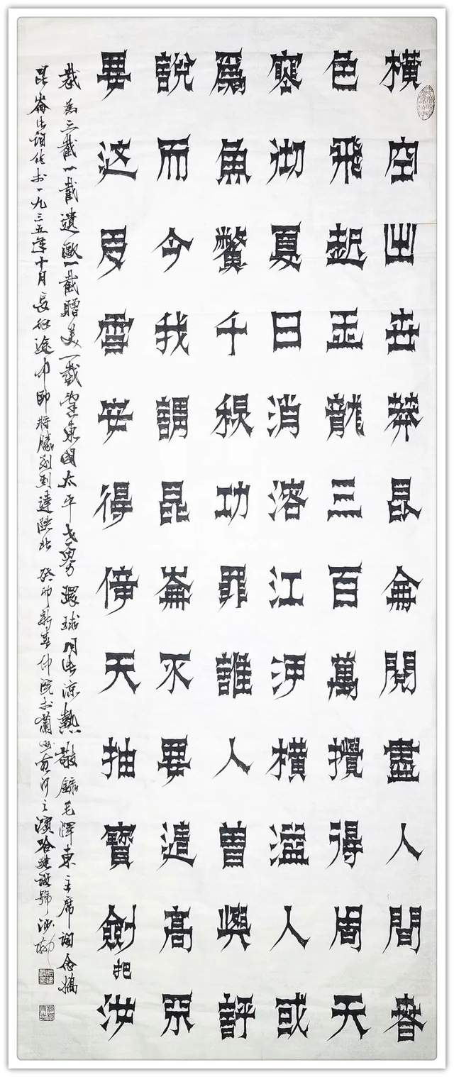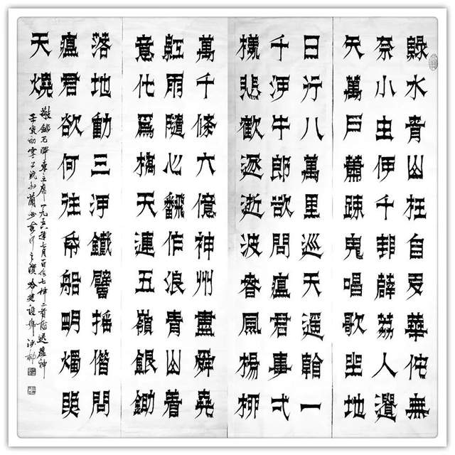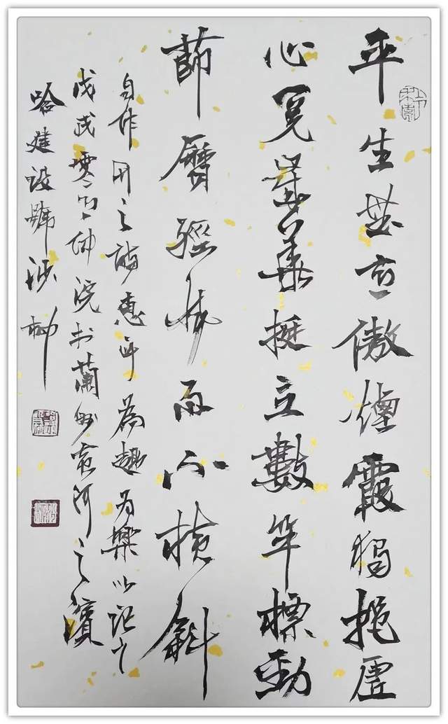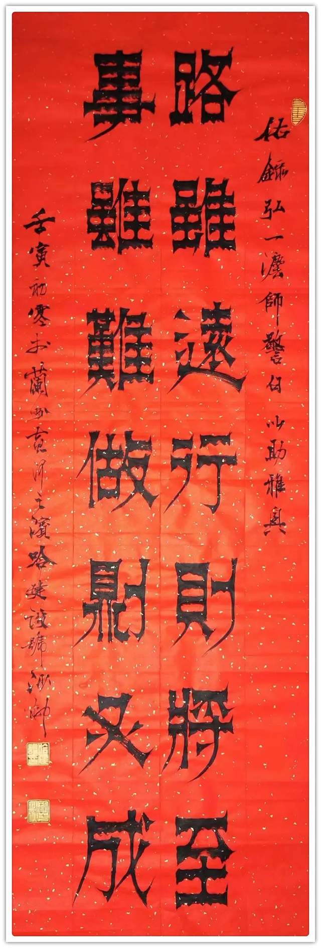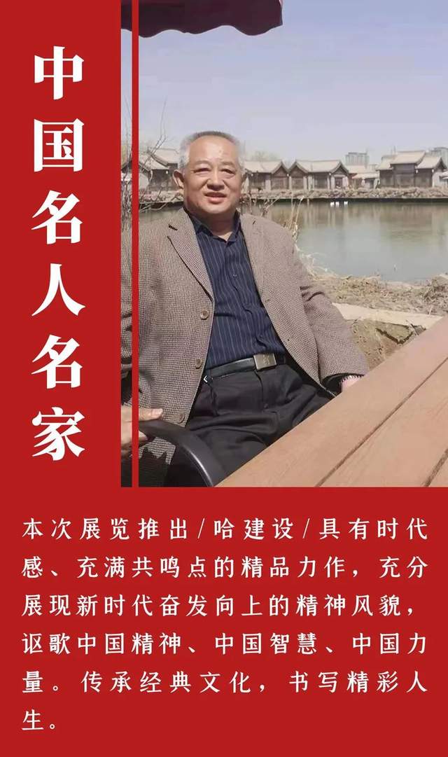 哈建设书法遒正刚决,风骨奇峭,气格凌云,正气逼人也。细究其妙,字恭韵足,多行方饬笔法,且结体严谨,法度井然;功道不俗,笔力遒劲,揽娴熟控笔之能,意如镌石镂玉之势,无真修难达此景,非识者难知其堂奥(节选自人民大学教授、博生导师,国家最具权威评论家陈传席<哈建设书评〉一文)。