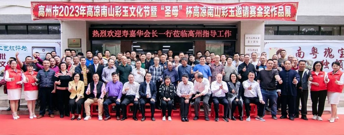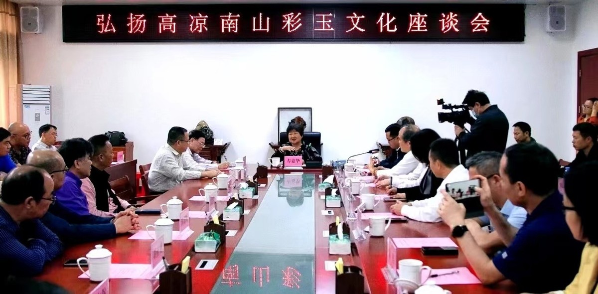 其后,参加了由高州市委、市政府举办的弘扬高凉南山彩玉文化座谈会。座谈会由高州市副市长刘仁生主持,致欢迎词中他表示:高凉古郡,鉴江相依,人杰地灵。高州是一座历史悠久、文化底蕴深厚的城市,巍巍云开,悠悠鉴水,铸就了一方瑰宝——高凉南山彩玉。早在宋朝庆元间,副丞相洪迈收到时任广西转运使赏石名家朱希颜赠送的两块珍藏的高州彩玉石,如获至宝,赋诗咏赞撰《高州石屏记》,并镌刻于广西桂林的龙隐岩,成为国家文物旅游胜景。高凉南山彩玉吸收天地灵气,皮质细腻,光彩照人,具有极高的文化品味和收藏价值,在高州乡贤——广东省地质局原副局长、广东省观赏石协会创会会长、高州市高凉南山彩玉协会永久荣誉会长周国新的努力下,省地质局拨出专款派出专家,走遍粤西山山水水勘测之,并把勘测成果送到中国观赏石协会。经中国观赏石协会观赏石命名审定委员会第一次会议专家评审,高凉南山彩玉成为新世纪第一个被正式评定的中国新玉种。寿嘉华副部长欣然题词,“高凉彩玉南粤瑰宝,璀璨毓秀独领风骚”。