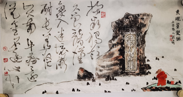癸巳夏,顷接中央美院入学通知书,五十五岁的我,几经努力终于成为姚鸣京教授“山水画语言研究”访问学者。芒种日由京返扬参会,带回“道济觅崖图”八尺整巨画,待补上摩崖元素并得七绝一首。