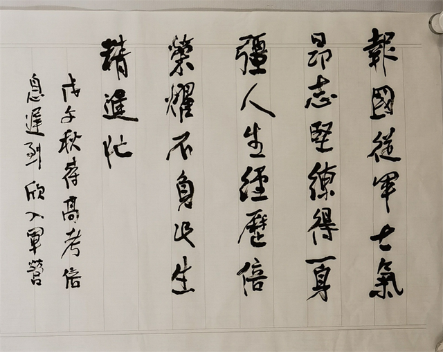 戊午秋,等待高考信息未至,征兵开始了,在场团委汝奇书记的支持下,我如愿穿上了军装。插友们为我庆祝,微醺的我内热难忍开窗受风而“面瘫”,急返扬州治疗,好在无碍。在泰州码头乘船离开时,父亲赶来相送,他高兴呀!几年前家门上曾挂过“右派分子”的牌子现要挂“光荣人家”了。在船仓中渡过了一夜,天亮时上甲板,看到河左一座倾斜的塔,询知是虎丘塔,不一会下船看到“寒山寺”,排队走到石路“南兵营”,我的书画能力在新兵营中办黑板报上得到显示,评比几乎全第一,三十三岁的团长陈炳德(后为上将,总参谋长)经常表扬我。二零零八年夏来扬接见我时还提及当年事。