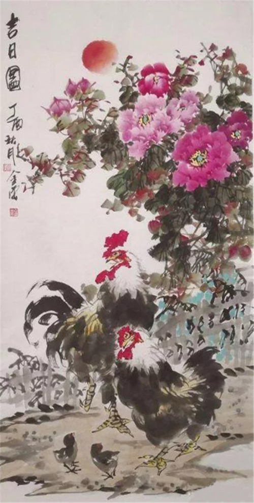 雄鹰是他喜欢的绘画题材之一,或雄踞松石,或翱翔长空。对于鹰这种动物的描绘,他笔锋犀利,纵情挥洒,整幅作品充满了刚劲的气势,在画面中用更加刚毅的线条来突出鹰的雄姿和霸气,让我们能够直观的感受雄鹰的凌烈姿态,在他的笔下,以公鸡作为主角的作品则显得充满了生活的情趣,画面柔和了许多,也更加丰富,将国画中色墨相融的技巧发挥到淋漓尽致。欣赏张金荣的国画作品,完全就是一种美的享受,是对于国画艺术的又一次膜拜。