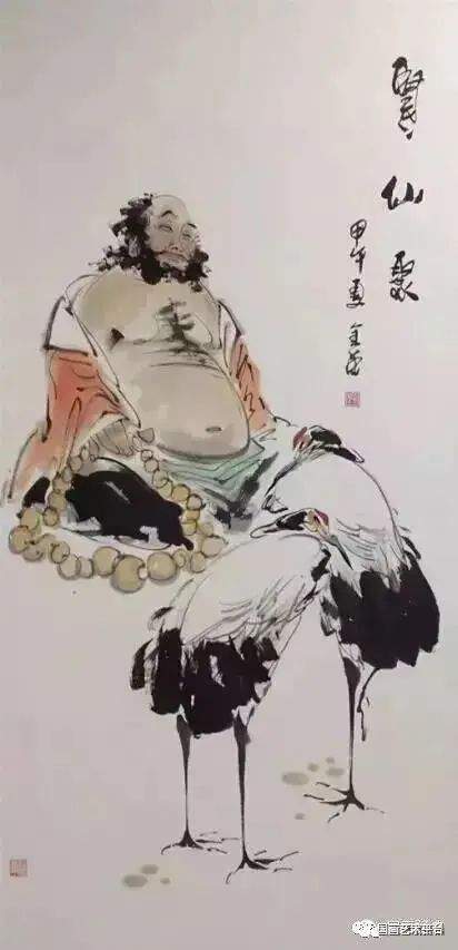 两只仙鹤栖息在松树的主干上,勾画出了人们喜闻乐见的通俗题材-健康长寿,松鹤延年。在造型刻画上,仙鹤神情安定,胜似闲庭信步,给人一种与世无争,泰然处之,安居乐业,幸福美满的感觉。最值得一提的是整个画面线条老辣而又苍润,不出干笔,多以湿笔运行,所以感觉流畅、滋润,有韵律在舞动,你的心情也会随之荡漾。张金荣的国画,可以说是纯文人画。有着丰富的文化内涵,古朴、典雅、厚重、沧桑,饱含丰富的中国古典哲学。