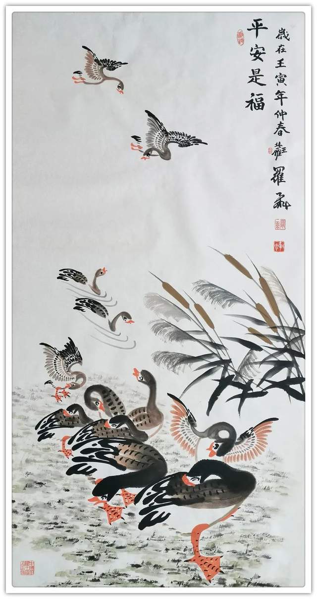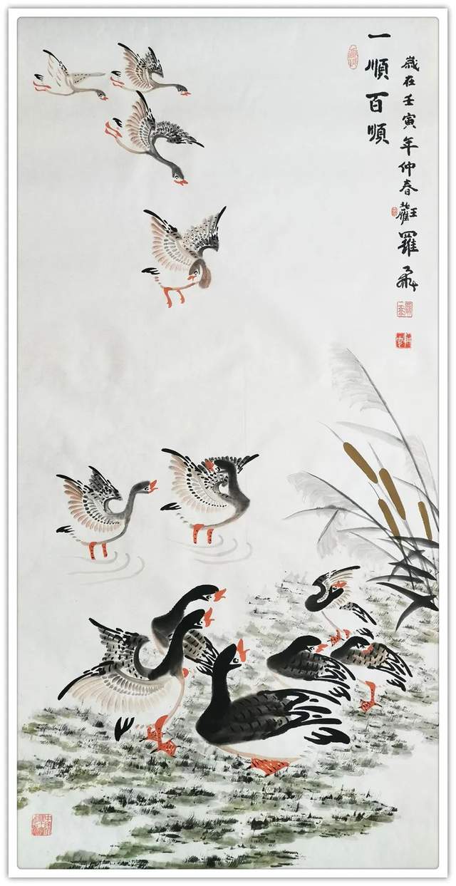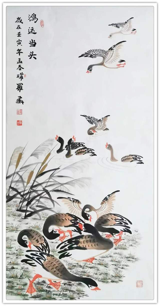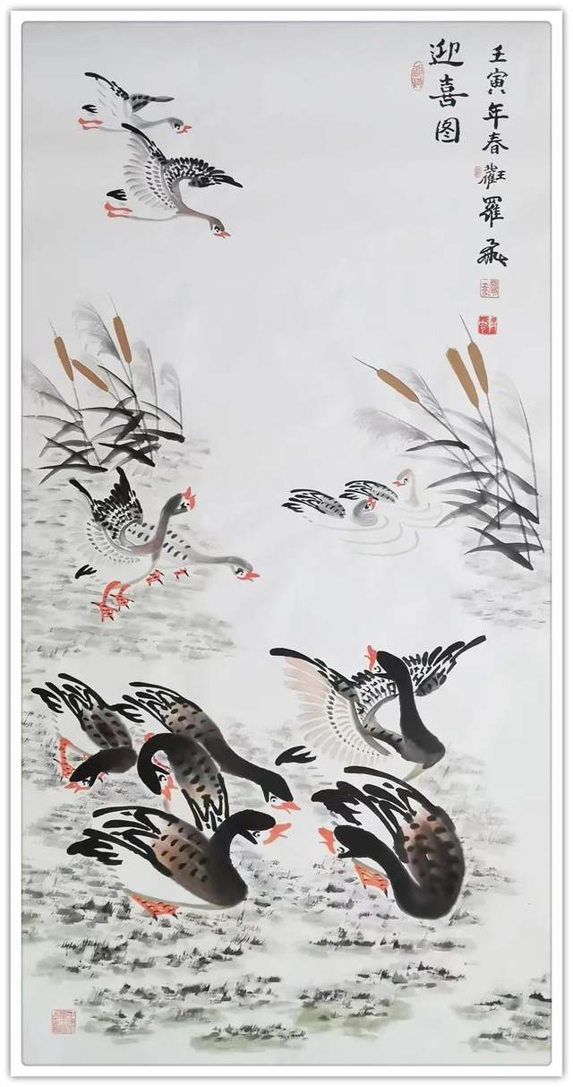 中华人民共和国国宾礼特供艺术家罗维存以专绘鸿雁著称当今画坛,他笔下的鸿雁如仙女下凡神态各异、食宿飞鸣、千姿百态、栩栩如生、神韵十足,表现出极大的生命力。北雁王・罗维存为人处事淡泊名利、重义情深、书生意气,学者风范。他的鸿雁作品让人心旷神怡。