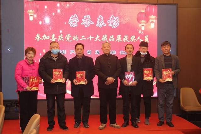 红色藏家为红色活动颁奖,刘仁怡先生为参加“喜庆党的二十大藏品展”颁奖时与获获人员的合影。