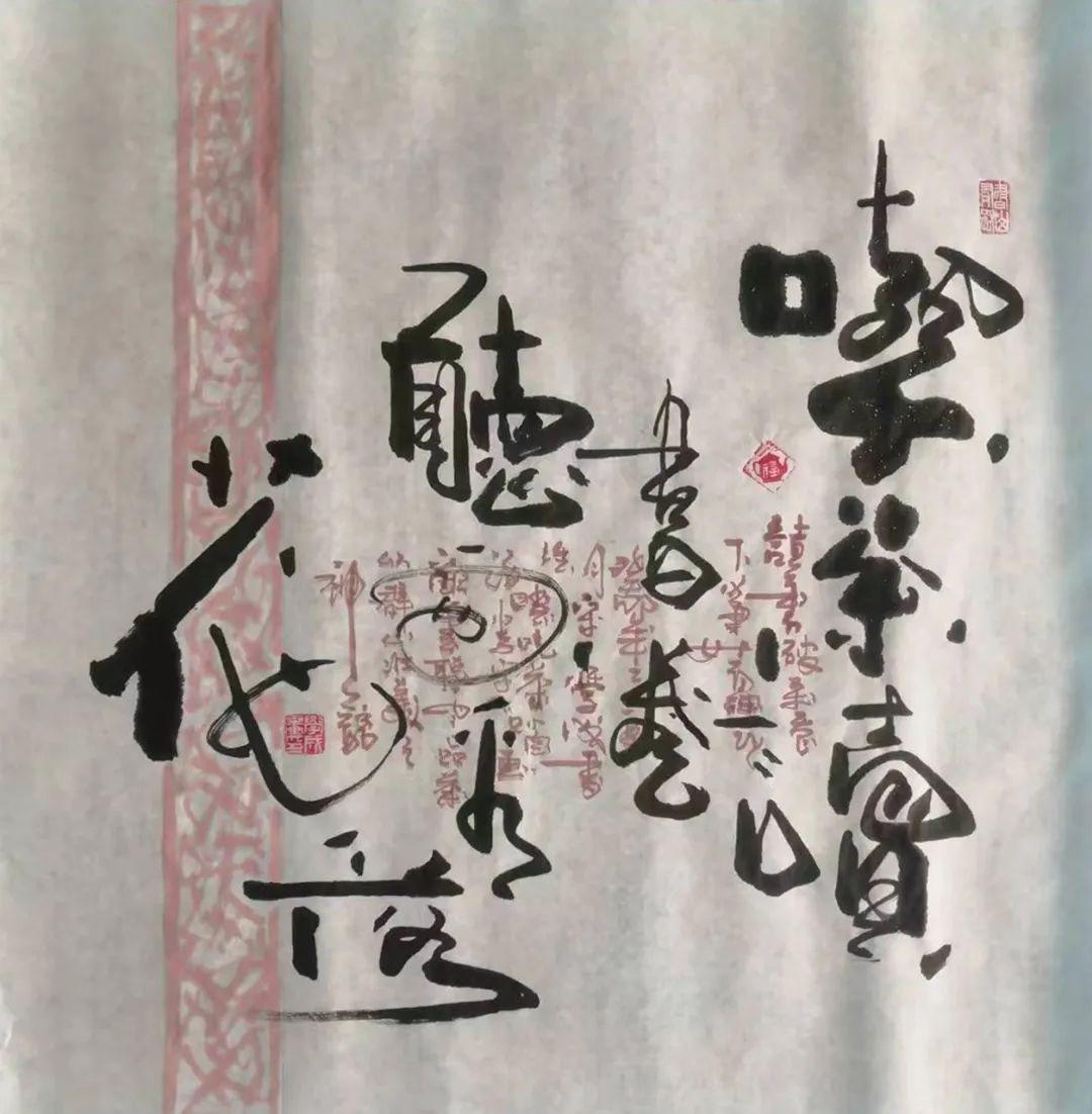 作者从小受祖父影响,7岁开始临帖习画(楷书以柳)颜体为根,隶书综(曹全碑)(乙瑛碑书)以甲骨文等行书则师。(赵孟頫)兼学二王。多年来刻苦揣摩,兼学并取之长,形成了自己的声韵之大雅,飘逸以不俗之美感。