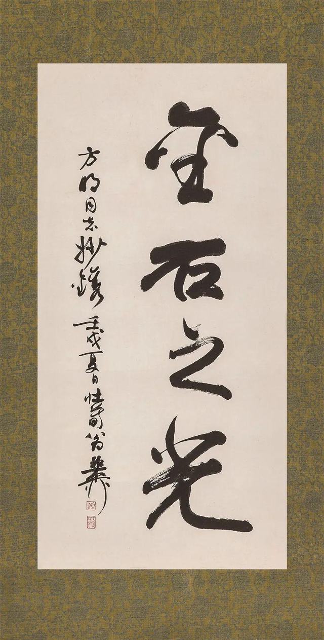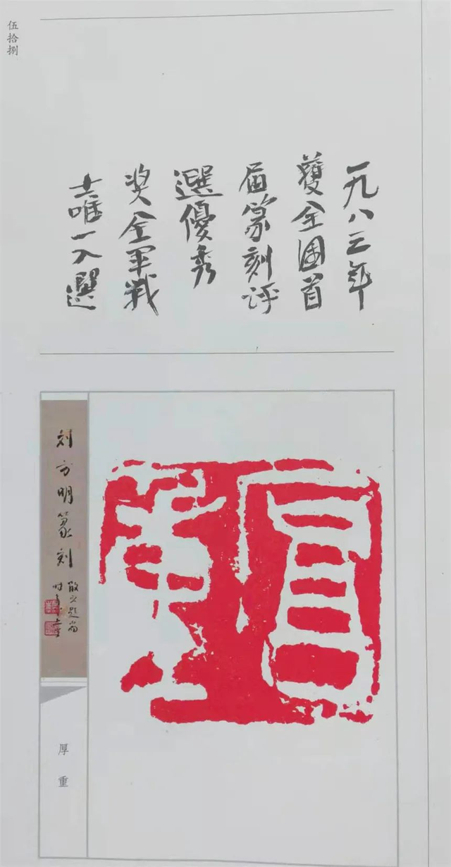 1983年夏日谢稚柳先生为刘方明的【山筋石脉篆刻法】作品“厚重”获全国篆刻征高优秀奖题字;“金石之光”。