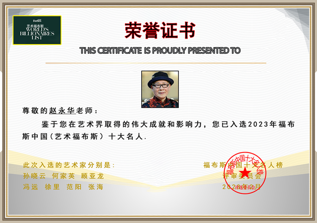 2021年由中国书协中国美协等部门评定为"德艺双馨人民艺术家"称号。2021年评定为聚焦两会形象大使称号,同时出版《聚焦两会》特别推荐著名艺术家赵永华大师的恢弘巨著中英文版,发行60多个国家。同年又获得由联合国发起评为世界和平艺术形象大使桂冠。