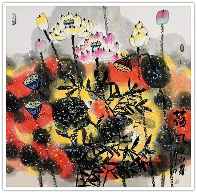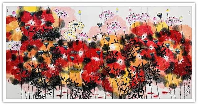 搞新彩墨画创作,最需要色彩渲染的火候。如果火候超于“度”,则是满纸烟火气,糊涂一片,审美的唯美效果大打折扣。如果火候低于“度”,则新彩墨显浮滑,很难有立骨磅礴的精气神。如何掌握这个“度”是非常难的。贾绍昌的新彩墨铺陈,极见调度和谐的玄机要妙,大墨淋漓,浓彩巍巍,正是色不碍墨,墨不碍色的恰到好处!流丽可以悦目,清新总能切意,画江南水乡掩荷花,总有一天清淑气,万里碧榆风的气韵生动!