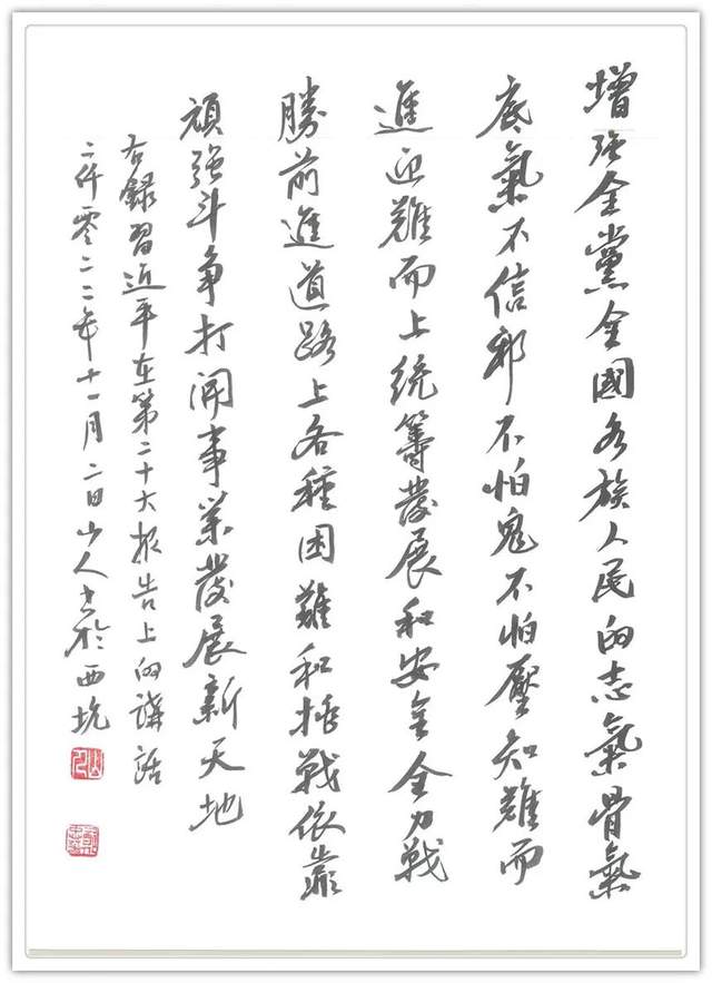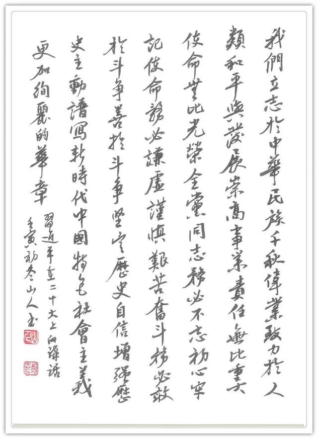 当代书法有江湖体的肤浅与粗糙,笔墨任意涂抹,难见书法的雅观质量,这是书法文化含金量不断减缩的重要原因。郑忠华先生有弘扬书道的矢志不移,所以他能够避开一切江湖书法的干扰,通过对历代法帖的心追手临,把书法源于书卷的优雅展示得特别到位,这是娴熟的技法才华,也是书法渊妙代不绝人的奇绩。郑忠华用自己优雅而高贵的笔墨修养,为书法文化的春秋传承奉献了可贵的力量。虽然书法功夫炉火纯青,但是有永远不满足、永远不停步的研习动力。他以历代法帖为敬仰高峰,数十年来总是处于不断攀登的进程当中,以令书法品质无限逼进书圣的境界!