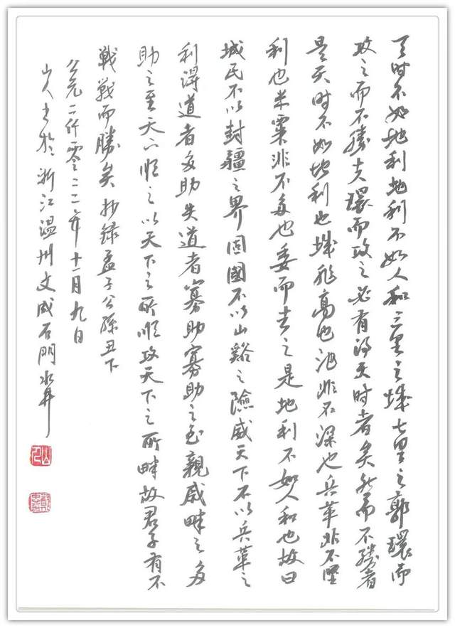 习书无数载,染一池青墨,用千竿笔毫,不被浮云遮望眼,贵有源头活水来。他把书法习成当成一场永无止境的文化修行,所以行书写得不激不厉,伸缩得体。带着“和”的导向,作出“妙”的创作。一划之间变起伏于峰杪,一点之间殊衄挫于毫芒。笔里有墨,墨里有笔,前后相随,高低有趣。赵子昂有书论言,结字因时而转,用笔千古不易。郑忠华书法深谙此论,书法结字映时代风范,抑左扬右,山水风吟。书法用笔万千变化,纤纤如新月之出天涯,落落犹众星之列河汉!善结时代新体,能恒用笔玄机,郑忠华书法恰有借古开今的经典风貌!