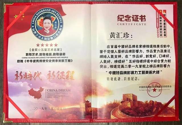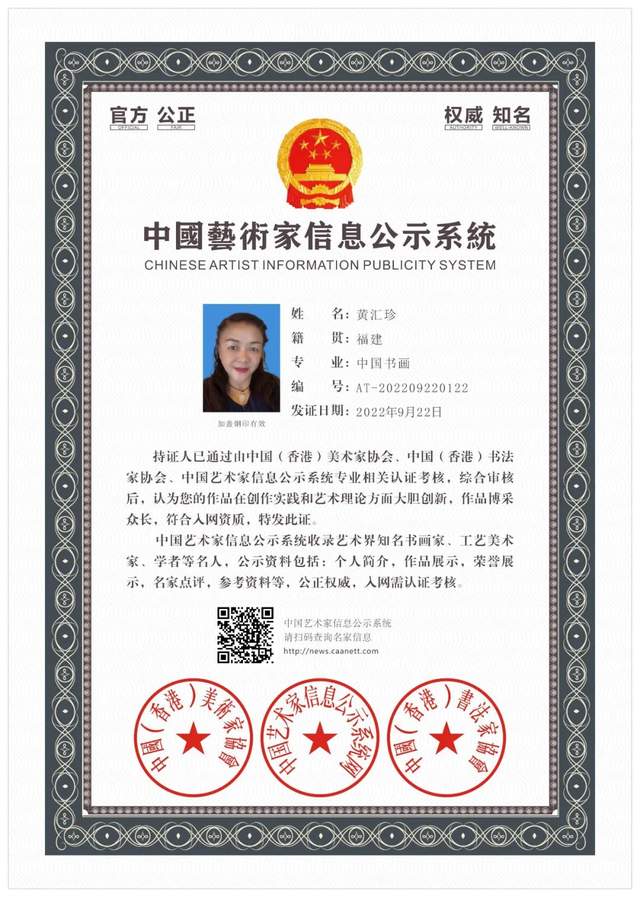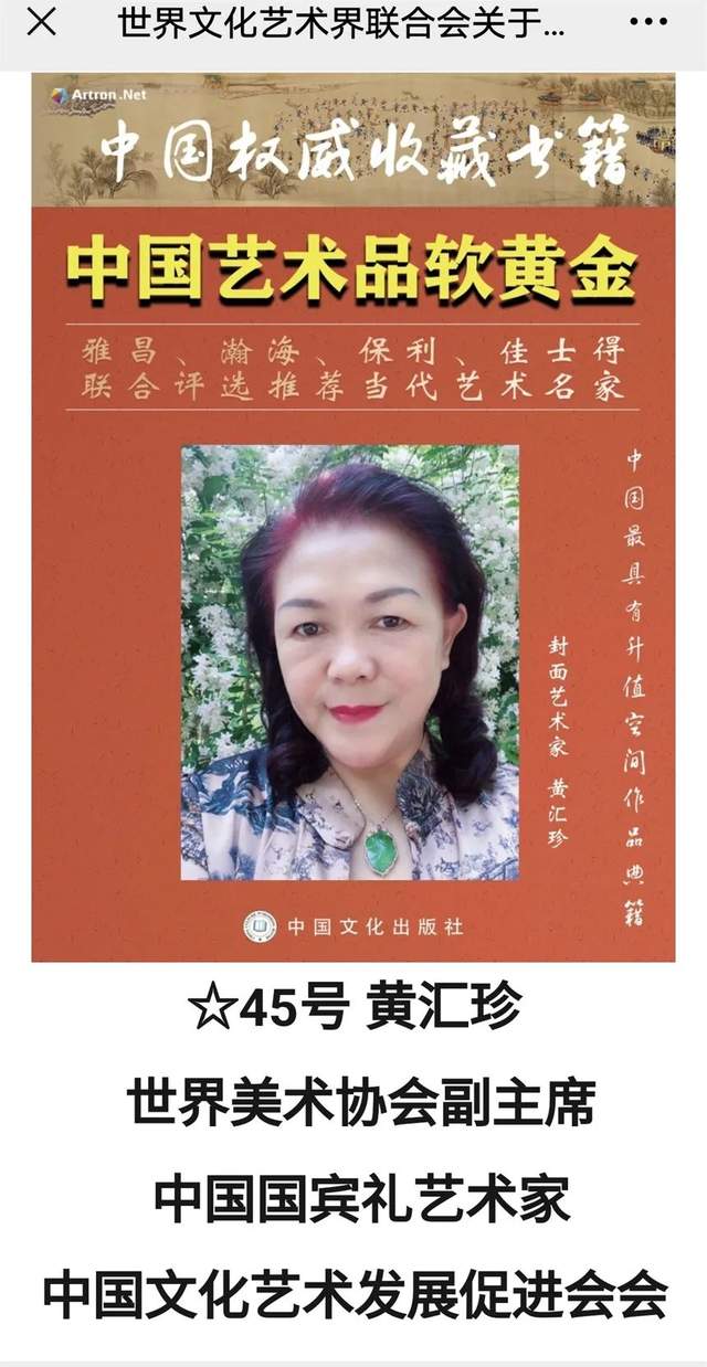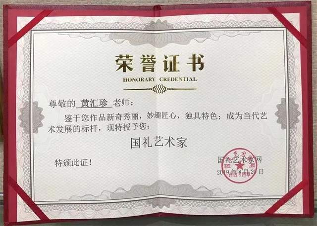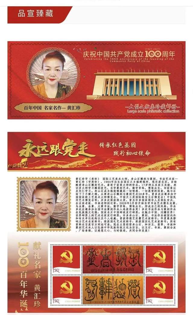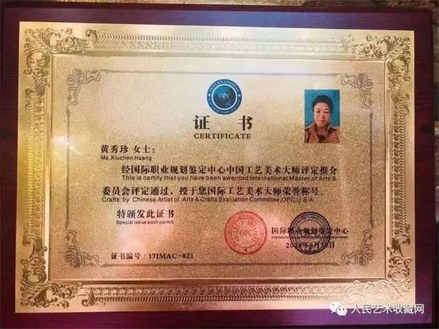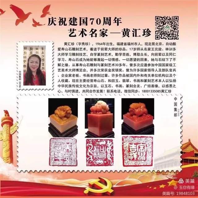 艺术简历:国礼艺术家黄汇珍:字秀珍—— 1964年出生在国石之乡福建福州,现定居北京。自幼酷爱寿山石雕刻艺术,着迷于前辈大师的珍品。17岁师从名家王炎銓、林训多大师学习雕刻技艺,自学篆刻艺术,勤学苦练,博取众长,向前辈以及同仁学习。寿山石成为她能够激起一切情感、一切愿望的因素,她与石结下了不解之缘。弘扬中华民族传统文化艺术,从事寿山石雕刻与篆刻艺术30多年。曾多次应邀参加中国国家级工艺美术大师博览会、中国天工奖国际珠宝玉石博览会、中国民间艺术博览会等,并多次荣获得大奖,金奖银奖十几次。曾为许多国内外领导人及部队官兵、企业家老板、书画老师刻过章。自学篆刻书法艺术,擅长龙篆、龙爪篆、鸟虫篆、金篆、大篆五体书法,勤学苦练、博取众长,形成自己的风格。作品多次应邀参加全国第四届中华杯诗书画印艺术大大赛荣获金奖、荣获全国第五届中华杯诗书画印艺术作品大赛荣获入选获得特别金奖!荣获世界非物质文化遗产大会主席吉姆余慈授予黄汇珍女士世界非物质文化遗产大会传承大奖。书法篆刻作品在民族强文化强:国家名片中国邮政发行邮票。在中国邮政:建党百年华诞献礼名家发行邮票。在魅力中国、闪耀世界!世界邮票上的艺术名家发行邮票。许多寿山石、篆刻、书法作品作为国礼赠送国内外领导收藏。诸多书法作品被国内外领导和有关单位机构以及个人收藏。曾获得德艺双馨艺术家称号;华夏最具影响力艺术名家称号;荣获国礼艺术家称号;荣获国宾礼艺术家称号;荣获国宝级艺术大师称号等。所有资料在百度官方网站可查。现在主要经营寿山石、和田玉、翡翠、书画和篆刻艺术,本人以弘扬中华民族传统文化为宗旨,以玉石、书画、篆刻会友、广结善缘,以感恩之心、与时俱进,共同合作发展。现为:《国际职业规划鉴定中心International occupational planning certification center(简称OPC)国际工艺美术大师》