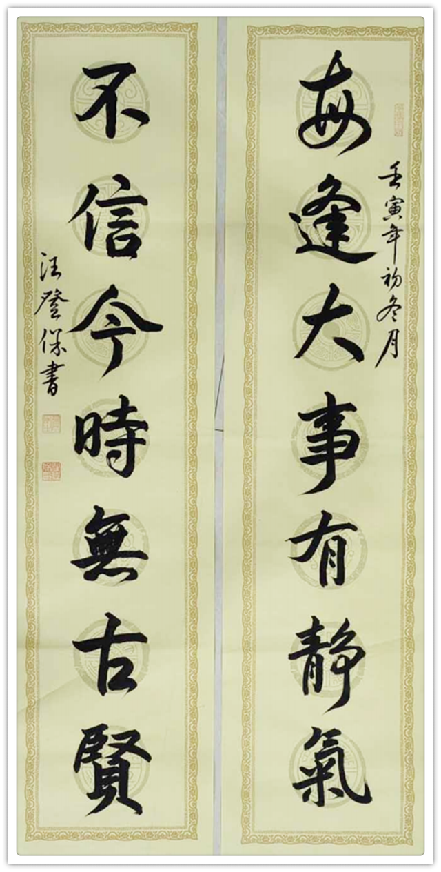 书法作品多次向全国“两会 " 献礼,被人民大会堂及国家多部门和大专院校博物舘收藏。由天津人民美朮出版社首次出版发行的书法“大红袍”《中国近现代书法名家集一汪登保》,2018年11月在中国孔子研究院,由天津人民美朮出版社,中国孔子美朮舘,九江市政协等多家官方权威单位主办和承办《汪登保大型书法艺术展暨“大红袍”书法首发式圆满成功。