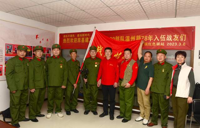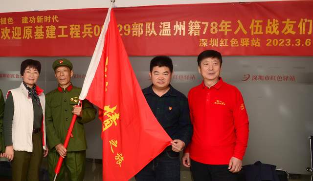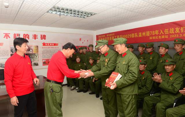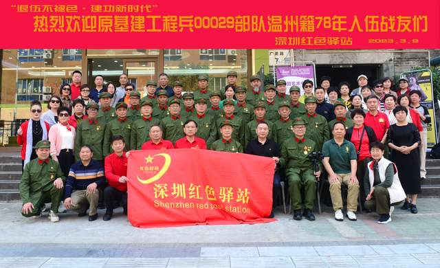 3月6日,深圳红色驿站党支部书记王胜文,常务副站长刘对现,副站长冯忠兴、秘书长马献志,副秘书长曾超炎、吕胜利,宣传部长卢兴求等热烈欢迎原基建工程兵00029部队温州籍78年入伍战友们!