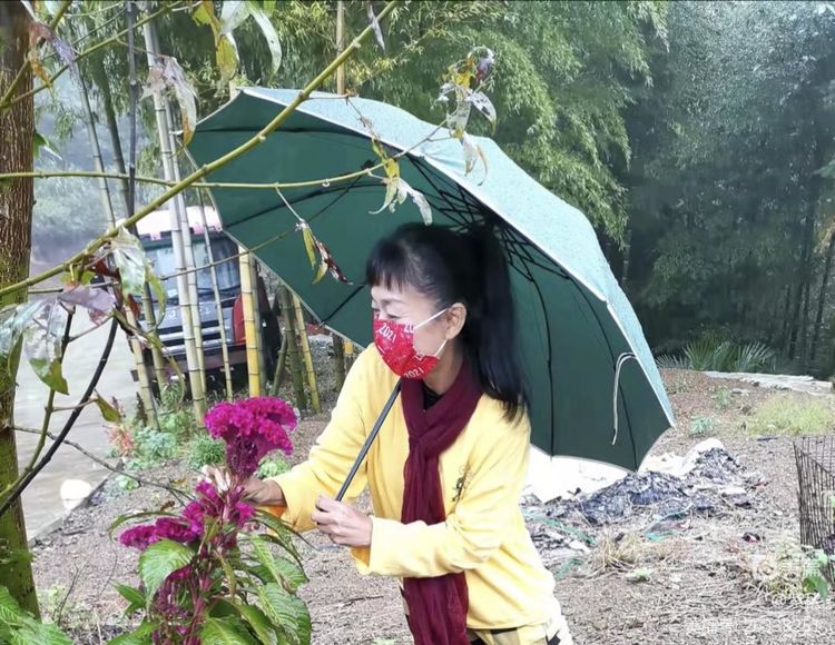 2021年10月,紫秋在参访湖北通山林上村时观赏鸡冠花(摄影/通山县老区建设促进会副会长廖长河-已因公去世)