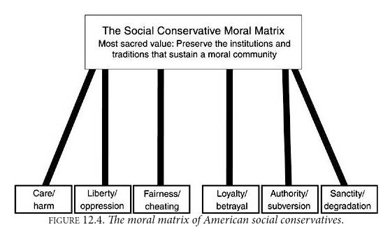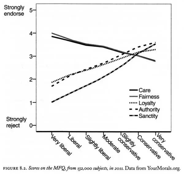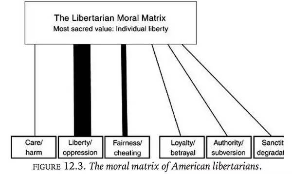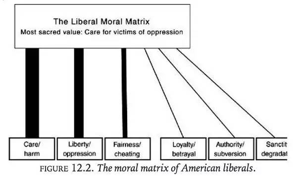 其实不管你是自由主义者还是保守主义者,你在内心一定都把自己视为英雄。而所有的英雄故事都是同一个套路:现在世界上有个威胁,我要解决这个威胁。自由主义者的故事是这么讲的。世界上存在着压迫!某个国家的政府、强人和大企业正在压迫人民,而我们作为智者就要起来引导人们去反抗。打碎旧社会,建立新社会。我们以推动社会进步为己任。这是一个英雄解放人民的故事,它的核心在于对弱势群体的关爱和对不平等的愤恨。保守主义者的故事则是一个英雄出来防守的故事。人民的日子过得本来很好,突然来了一帮自由主义者,他们同情罪犯,反对我们的传统价值,败坏我们的道德理念,还把我们的东西分给说谎和不干活的人。所以我们要跟自由主义者战斗!你说这两种理念谁对谁错呢?其实正确的办法是就事论事,对每个具体议题做具体分析。可是大多数人都是被意识形态左右的。科学家甚至已经发现了自由主义和保守主义的基因基础!在这方面基因对大脑的影响关键在于两点:第一,你是否对威胁特别敏感;第二,你是否喜欢追求新东西。如果你对威胁特别敏感,你就更愿意跟同胞抱成团去对付外敌— 这使我想起《中国不高兴》一书所说的”外部选择压”— 你就更倾向于保守主义。如果你在追求新东西和新经验中获得快乐,非常反感现有的秩序,你就更倾向于自由主义。我不太了解现在是否有足够证据说这两类基因决定了个人的道德模块优先级区别,但对于政治意识形态有先天因素这一点,我曾经看到过不止一个类似的研究。所以人一出生,大脑中在政治上的侧重点就已经种下了种子。这些特性将会指引你的人生方向,特定的基因会让你主动去寻找适合这个基因发展的环境,比如一个自由主义者会天生反感老师给定的纪律,主动去亲近自由主义艺术。你的世界观会围绕那两个英雄故事展开。人生的阅历和重大变故也许可以改变一个人的意识形态,但先天因素绝对非常重要。美国的两大政治派别各自能有这么多人支持,甚至自由主义者的理念还被某些知识分子当做”普世价值”,并不是因为他们能言善辩,而是因为其背后有这样的道德基础。自由主义者和保守主义者之外,还有一类”自由论者”(libertarian),其道德模块组合是专门强调自由,捎带重视公平,而完全不在乎其它所有道德 — 很像今天中国的自由派公知。因为自由论者缺少关爱的模块,他们很难获得更多人的支持。跟绝大多数美国知识分子一样,海特原本是一个坚定的自由主义者。但是为这个研究考察过多个国家的文化以后,他慢慢发现美国知识分子的想法其实是个特例。事实上,有人提出现代心理学其实研究的是世界上最 WEIRD (怪异)的一群人 — 这个词是这群人五个特点的缩写:Western, Educated, Industrialized, Rich, Democracy(西方的、受过良好教育的、工业化的、富裕的、民主的)— 像这样的人即使在西方社会中也是特殊的,他们的价值观跟世界上其他人可能格格不入。海特不到三十岁就去印度搞调查,最初无法理解印度人的神性观念和集体观念,但生活了一段时间之后他发现他能理解印度人了。他慢慢从感情上接受了印度人的道德观,甚至开始使用理性帮这套道德观找理由。像海特那样学会理解别人的道德观可不容易,各国的道德文化的确非常不同。此书中有个最简单的例子:请使用”I am …”开头写20句话。美国人写的大多是自己心理特征:我很开心,我很外向,我爱爵士乐等等。而东亚人则更爱写自己在生活中扮演的角色和社会关系:我是一个儿子,我是一个丈夫,我是富士通公司的雇员等等。我读此书读到这里,想到的第一句话是 I am Chinese .