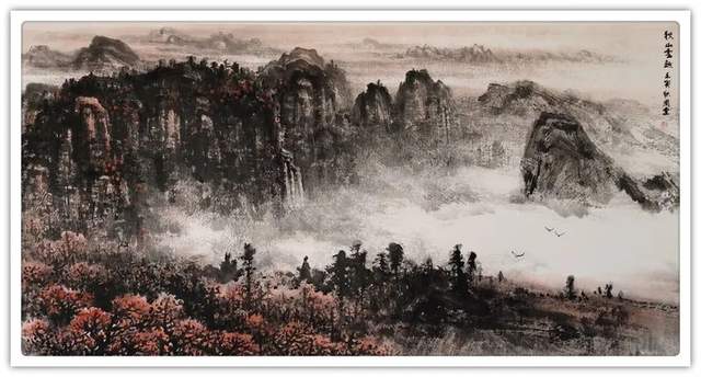 在山水创作的笔法上,先生不仅有对岭南技法的继承,同时也有自我笔法的创新,作品的选材亦是传承了岭南画派的风格特点,多林多水多云烟,通幅笔墨恰到好处,用笔轻重急缓,墨色浓淡相宜,绝妙的笔墨手法将崇山峻岭,奇峰兀立,云雾缭绕,古树藏山刻画得宛若天成,不仅如此,先生还以丰富多变的笔墨语言,将自然之美充分寄寓到了传统的笔墨构架中,使得整幅佳作传统而新颖,壮美且和谐。