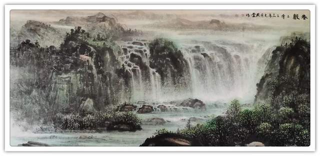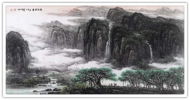 纵观其作,我已咏赞,每一幅佳作,气势均为连贯,境界亦是整体。拿其作品《春到南粤》来说,作品近景为溪河流水,涧边杂草仙草一一生发,石地过处,青草铺地,苍树耸立,树皮龙壳,青藤垂绕,行人陆续而过,远处景象雄山俊岭,山峦叠嶂,有瀑随顶落之,挟乱石而流泻,山松树林伴傍一片,中景徐徐云烟,境界超逸,神仙之属,其中若隐若现,仿有小路自云中显现,绕过山体及松林,画中虽无红日,但却有余晖,斜晖之中,一片仙境,令人想象无尽,趣味无穷。