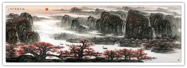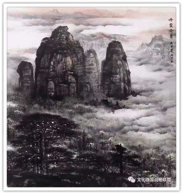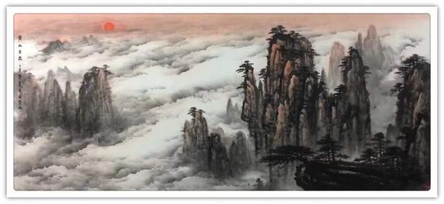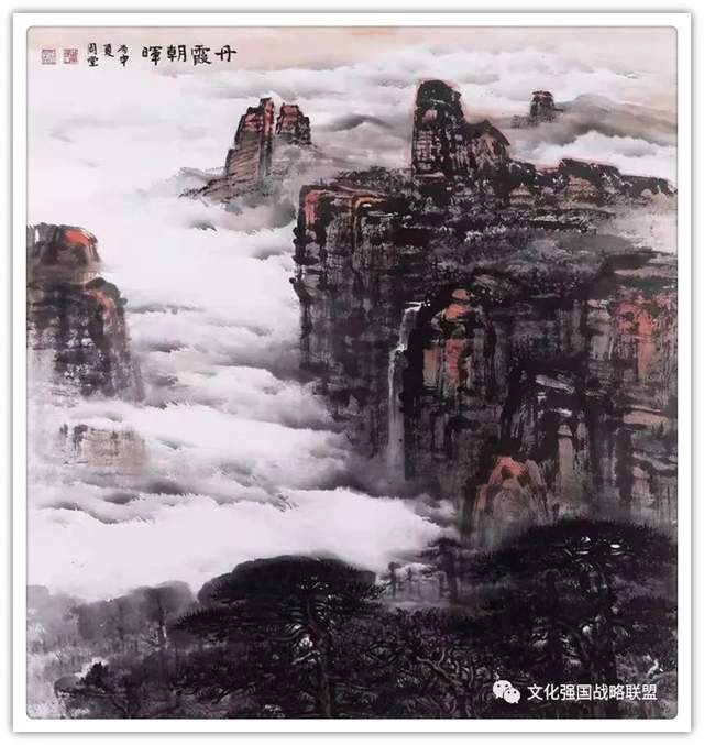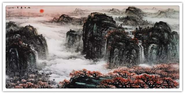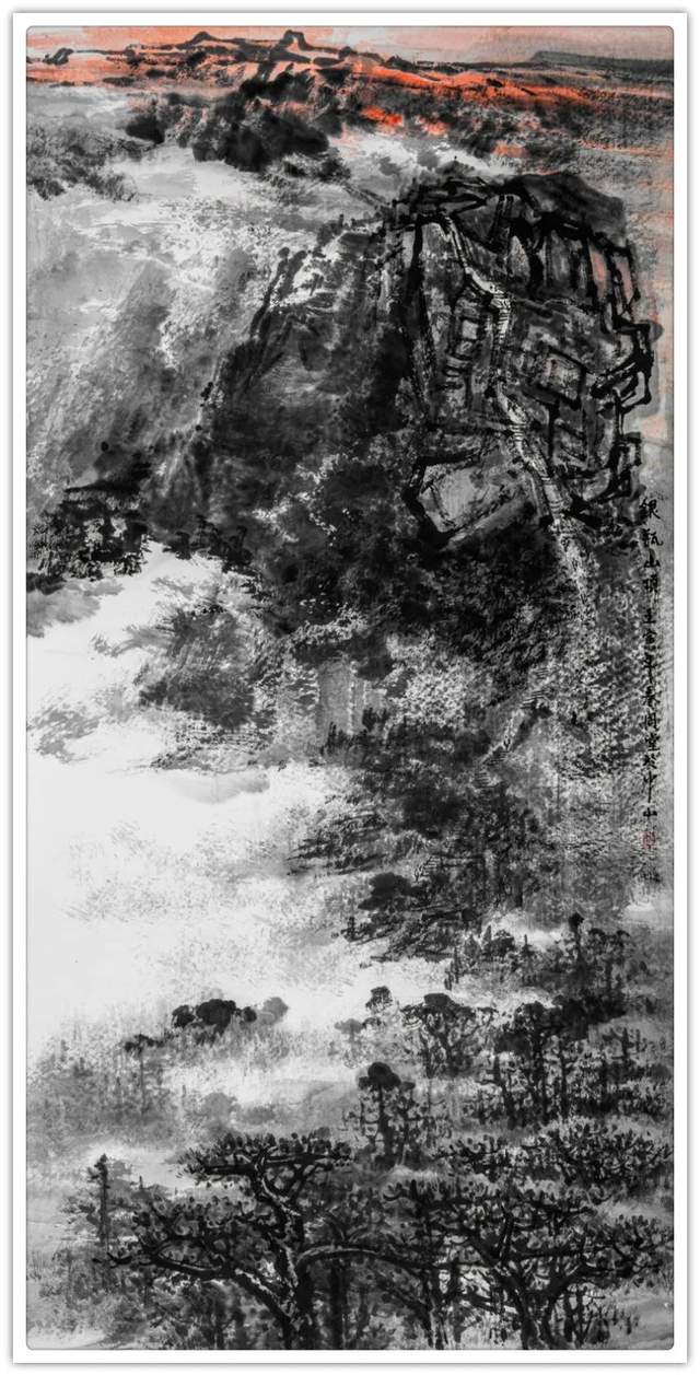 有言道,丹青难写唯精神,所谓雄浑,乃指底蕴,所谓大气,乃指气度。观先生的山水画,首眼落目,便使我产生一种撼人心魄,却又庄严肃穆的艺术感染力,换言之,先生之作,精神已达,底蕴震撼,气度不凡,颇有大家风范。通篇作品气魂宏大,开图雄健,云烟浩荡,在雄魄四溢的同时,还有着阵阵的文人雅致气息,令人心神畅怀,其作《丹霞朝晖》山体林立,霞光溢彩,天地之间纵生雄伟磅礴之气,作品《谷底清音》更是以极具视觉效果的绝壁为主体,在画中添以云水的穿插变化,将大自然的艺术张力与崇高意象展现的酣畅淋漓,内在韵致,沁人心脾,外在山势,豁人耳目!