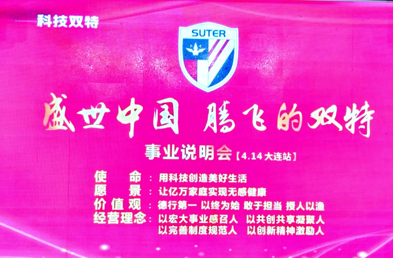 科技双特登陆大连,主办商周琳,应运而生,占尽先机,把握机遇,策划组办这场科技双特大连站事业会,邀名师、聚贵宾,请数百消费者,济济一堂在这说明会暨招商会事业会。时尚是科技双特人的生活,健康是打拼追梦人生命的护身符,科技双特人以用科技创造美好生活为使命,以让亿万家庭实现无感健康为愿景,以德行第一、以终为始、敢于担当、授人以渔为经营理念,以宏大事业感召人、以共创共享凝聚人、以完善制度规范人、以创新精神激励人的共建团队为运行训醒方针,科技双特说明会:科技双特大舞台,有梦你就来!