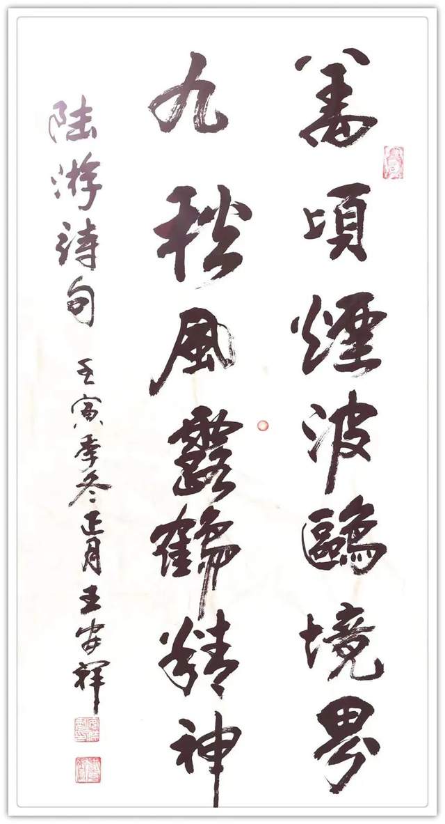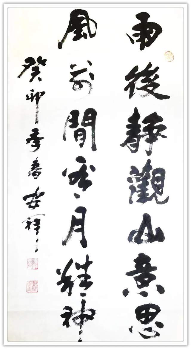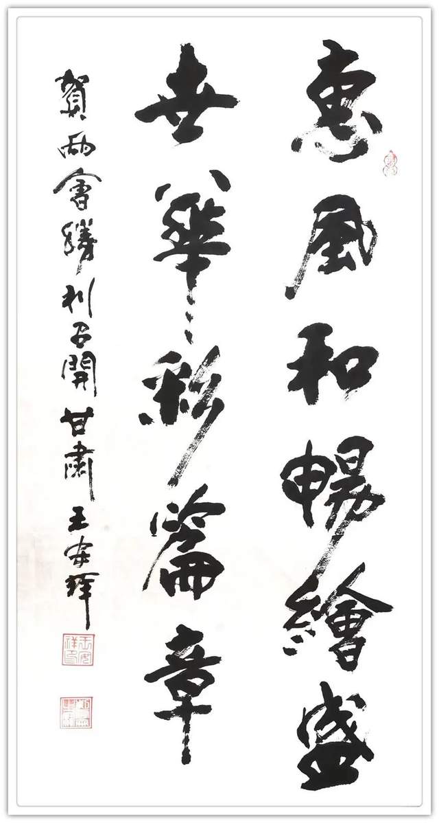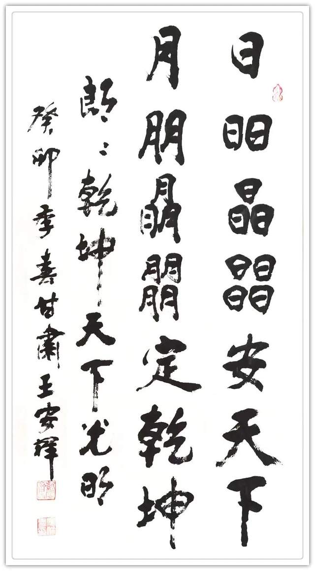 王安祥先生的书法作品已达到很高境界,见到其书法作品,就好像看到了他行走坐卧一样,通过一幅书法作品的构成形态,可就以和他交流、与他对话并能形成共鸣。这正是书法人格化、字如其人更深刻的含义和诠释,因而在业余书法写作与创作过程中(硬笔、毛笔),也都有颇多收获: