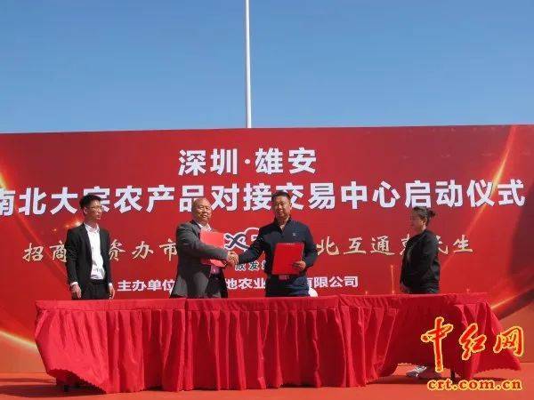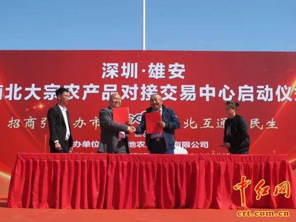 深圳市南山区西丽果场书记廖学文、黄湾村副书记郭燕祥、欣发地农业科技有限公司董事长苗自然为深圳·雄安大宗农产品对接交易中心