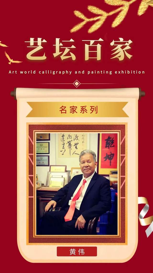 黄伟,笔名九渊,号霍山一剑。1945年生于广东龙川。国家特级书法师,博士学者诗人。以学术成就和诗书作品著名于世。创立“结构论”和“能本原论”。是我国“流域生态经济战略理论”带头人。曾任深圳市一类国企光明华侨农场集团领导。现任人民大会堂书画艺术顾问,孔子学院终身名誉院长,中国国际艺术馆名誉馆长,联合国金砖国家文化理事会会长,联合国美术家协会执委主席兼联合国教科文组织艺术顾问。诗书作品追求艺术与内容的统一,开创“尚情重意”书风,他的作品气象正大,清新典雅,豪迈旷达,富有时代气息。是“中国十四五规划文化建设奖”获得者,授“新时期国家文艺开拓者”、“中国文化品牌人物”和“人民艺术家”等荣誉称号。黄伟对世界和人类的贡献让他荣膺“联合国人类文化贡献奖”和“联合国和平艺术金鸽奖”,成为“联合国非遗传承人”,授予“联合国文化艺术勋章”、“联合国和平勋章”和“世界和平艺术学院”命名。