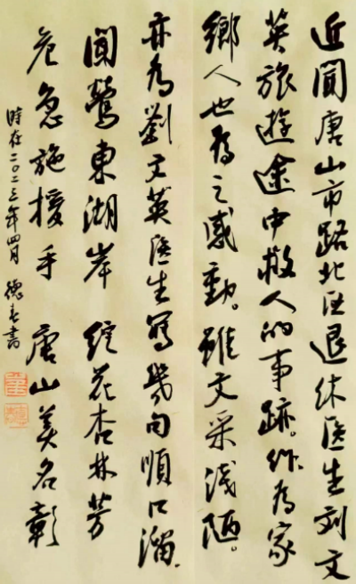 唐山市路北区书法家协会主席崔德春听闻刘文英事迹深受感动,著诗题字以表敬意。