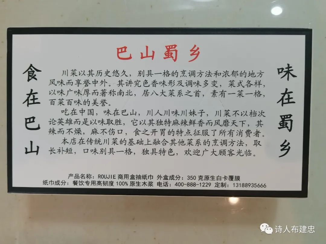 注1:巴山蜀乡酒楼位于济南市历下区康虹路泰悦赫府C8-106,餐厅环境干净卫生,装修简洁大方,大厅布置的很漂亮,让人用餐很愉悦。该店川菜选料广博奇特,品种菜样繁多,突出菜品的麻、辣、鲜、香、浓厚的特点,在制作的时候重用“三椒”,即辣椒、花椒和胡椒。经过精制的烹制,美味佳肴,令食者赞赏不已。该店在传统川菜的基础上融合其他菜系的烹调方法,取长补短,口味别具一格,独具特色,深受消费者的欢迎。
