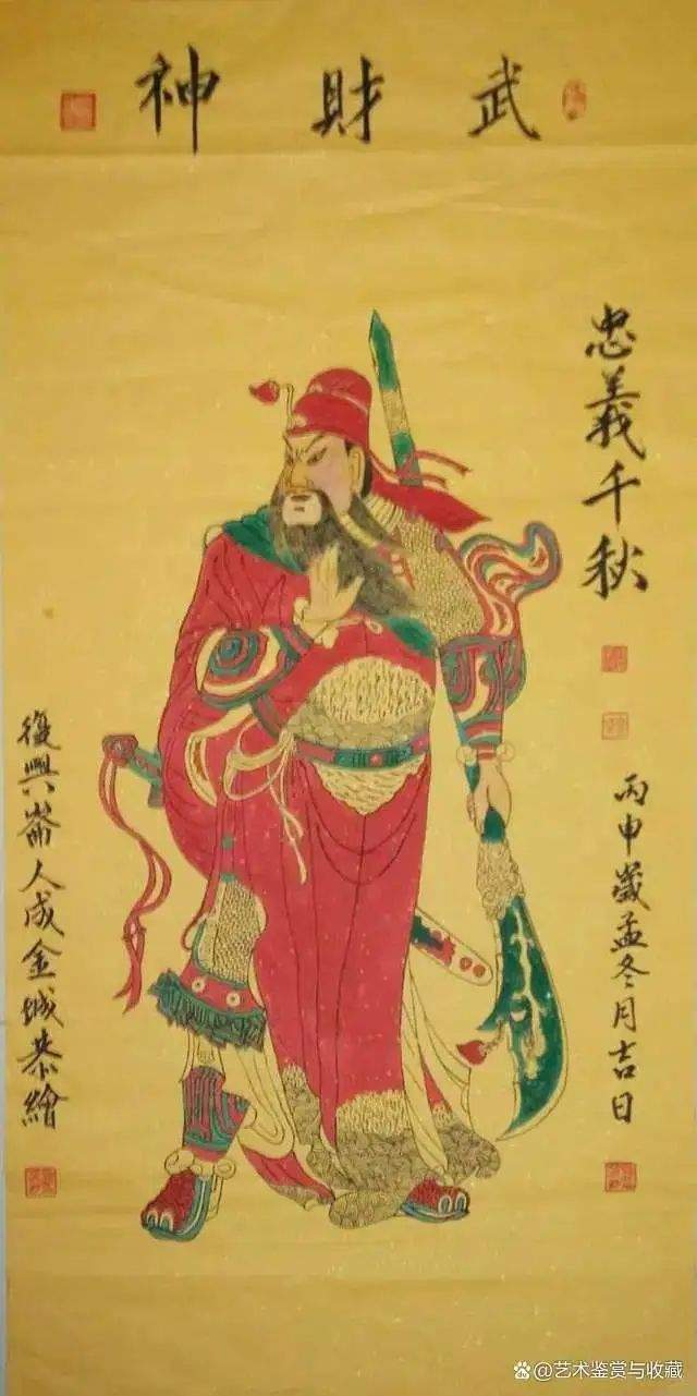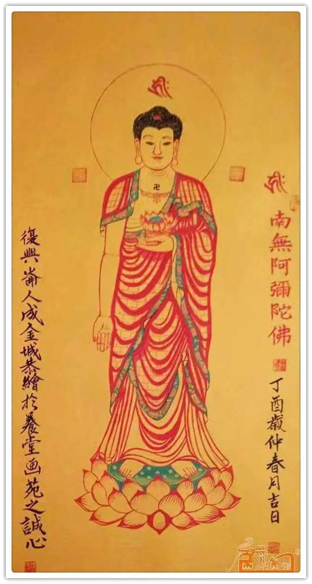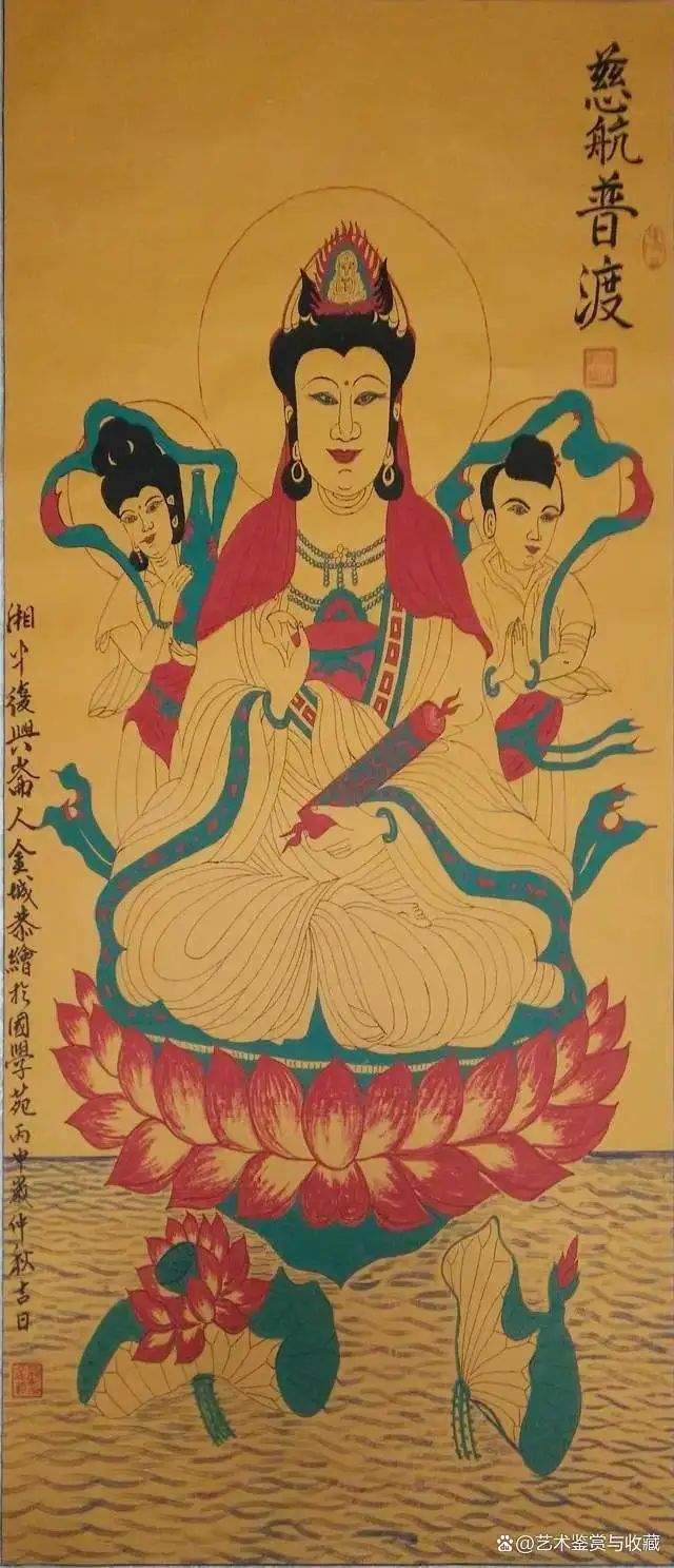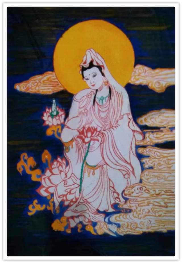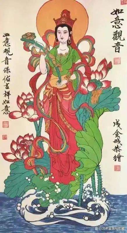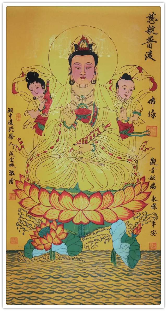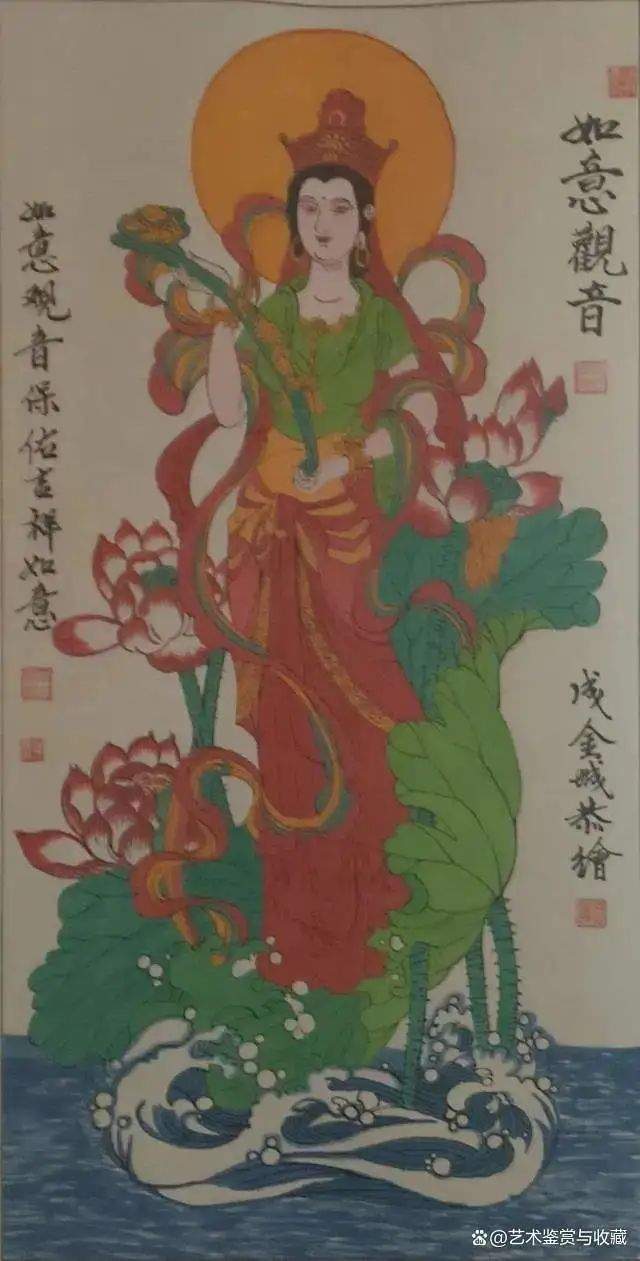 “生生不息,佛灯长明。”成金城的观世音菩萨画,简洁古朴,端庄俊秀,富丽尊贵,造型严谨;有一种发自内心的虔诚与崇拜。在中国文化中,观世音菩萨画是苦难众生的救渡者,其法力无边,以大慈大悲救济众生为本愿。成金城笔下的观世音菩萨画,在波涛汹涌的南海之上,红色莲花竞相开放,在莲花宝座上,观世音手持甘露指法,正靜听苦难众生的芸芸之音,两位童子一双手合十,一手持玉净瓶,在金色佛光的映衬下,显得庄严神圣。观世音法像圆满端庄,慈悲祥瑞,在柔美的线条中,红色点缀其中,使画面更和谐亲切。